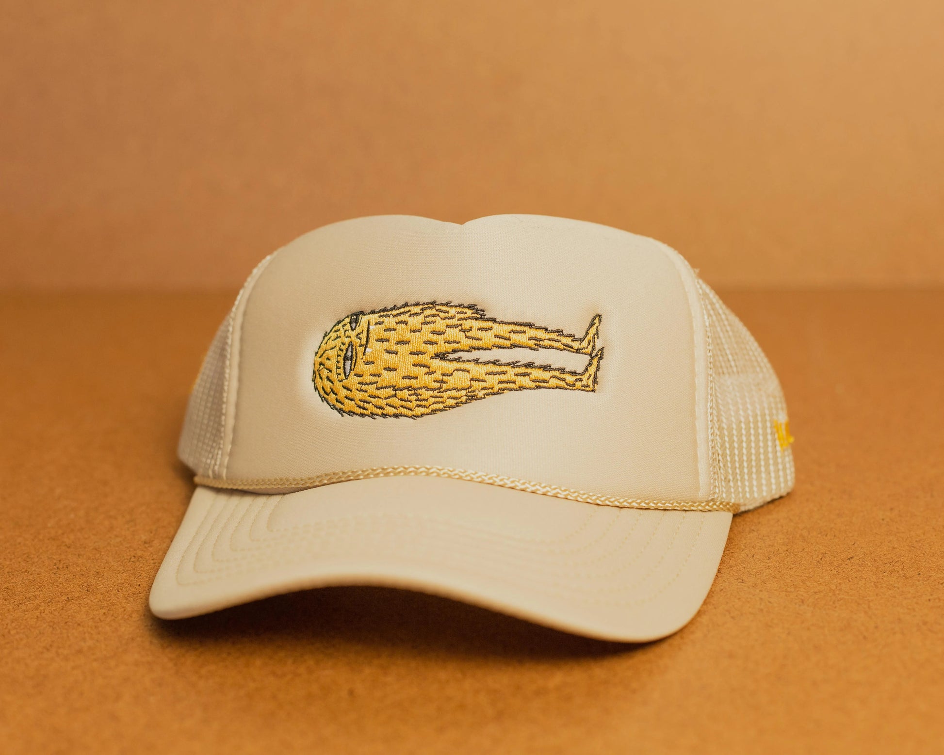 -Tan trucker hat with front embroidered Hairy Fool graphic.